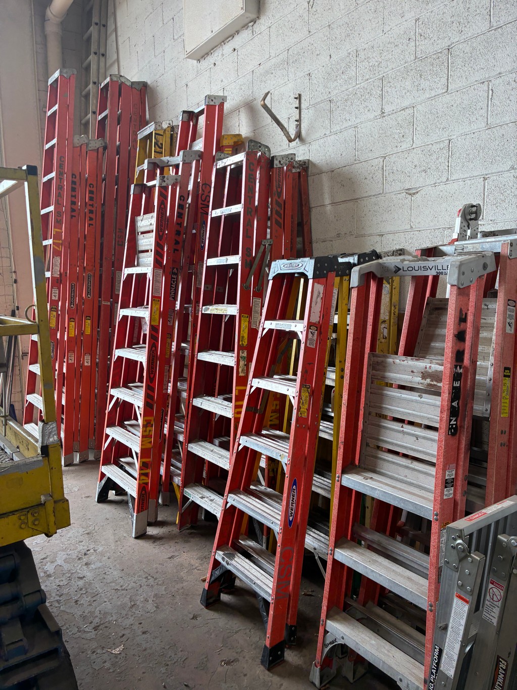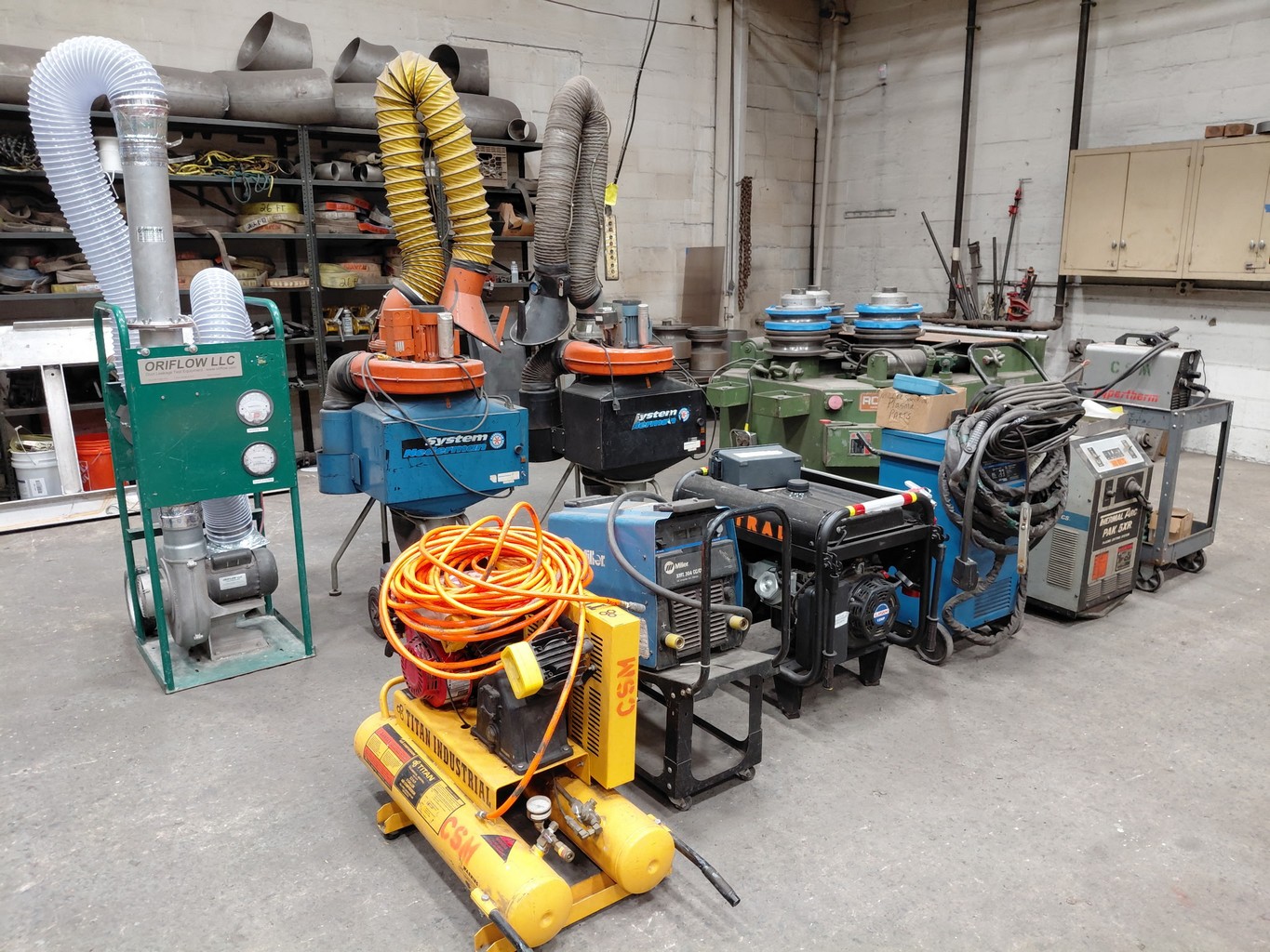 • Numerous Vidmar Tool Cabinets, Stainless Steel Bolts & Screws, 60” x 144” x ½” Rolling Steel Table with Plastic Wheels, 48” x 120” x ¼” Steel Table, Flat Wood/Steel Platform Rolling Carts with Steel Casters, Manual Tube Bender with Dies, Fiberglass Ladders, Large Quantity of Power Tools, Hilti Power Tools, Pnuematic Tin Knocker Hammers, Sanders, Hand Tools, Lifting Chains, Harness’s, Oriflow Duct Leak Tester, Lifan 8500IE Platinum Pro Series Generator, C-Clamps, Welding Clamps, Torches, 48” x 120” x ¾” Steel Table, 72” x 120” x 12” Thick T-Slotted Lay-Out Table, Rockwell 1/2HP Single Phase Double End Buffer, Magnetic Sheetlifts, Numerous Floor Fans, Large Qty. Of Gang Boxes, Scrap Hoppers, Rolling Steel Tables, Assorted Combi Punches, Raptor Stinger Mobile Fall Cart, Rolling Stock Ladders, Manlift Forklift Attachment, Pallet Jacks, Grinding Wheels, Bottle Jacks, Globe 1,100lb. Rolling Lift Table, Milling Vises, Collets, End Mills, Drills, Taps, Strapping Carts, Welding Wire & Welding Rod, 2-Door Flame Proof Cabinets, Victor Track Burner, Diamond Pacific 65T Rotary Tumbler 11” Dia x 16” Long, Custom Made Double Sided Cantilever Racks, Etc.