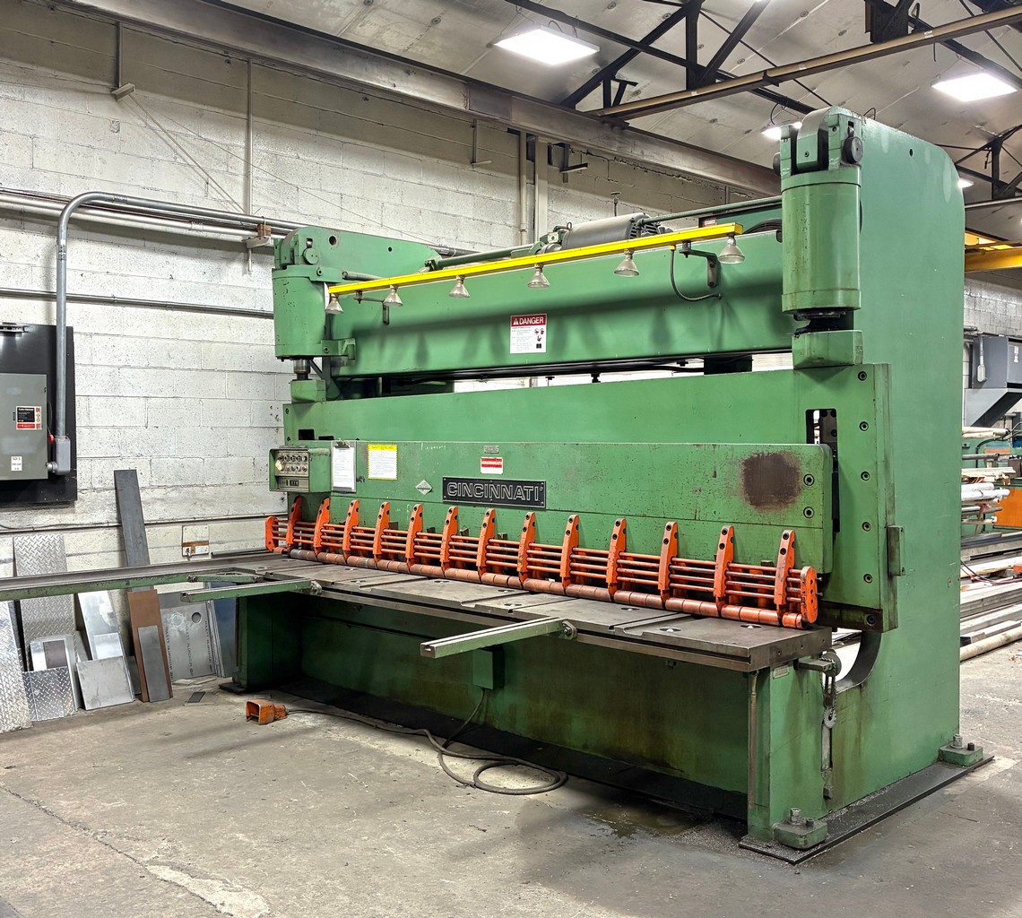 • 12’ x 5/8” Cincinnati 5FL12 Hydraulic Shear, 40” Front Operated Power Back Gauge, Central Lube, 19” Gap, 153” Squaring Arm, (2) Front Supports, Single/Continuous Operation, Ball Transfers In Table, Top Mounted Hydraulics, Foot Switch, S/N 40609 VIEW LOT #0C