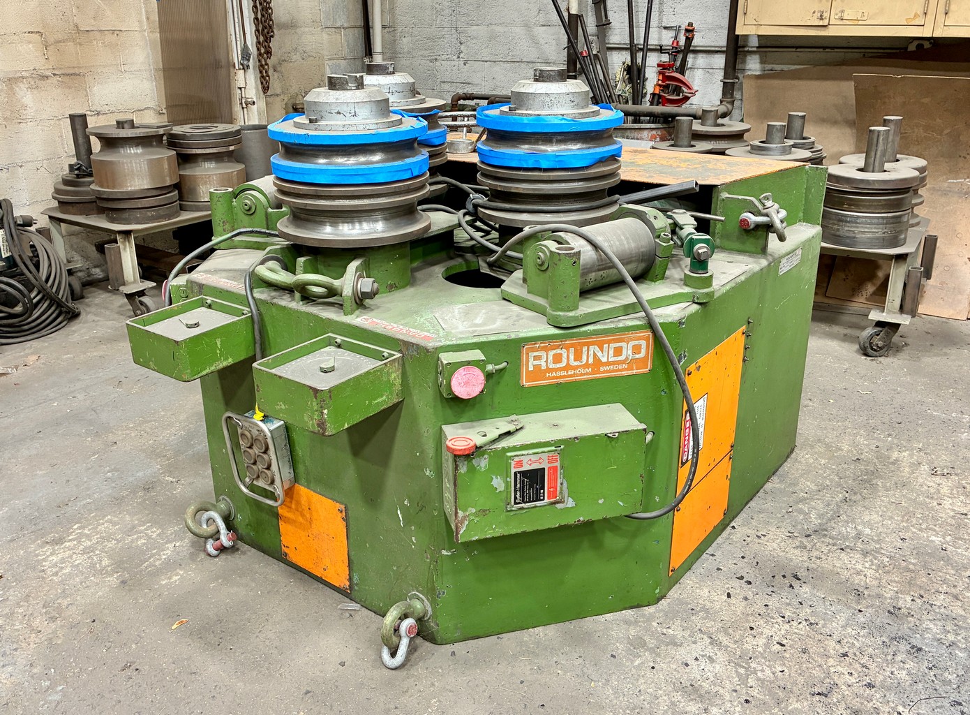 • 4.5” x 4.5” x 1/2” Roundo R-5 Hydraulic Vertical/Horizontal Angle Roll, Vari-Speed Pendant Control, 0-23 FPM, 5” x 5” ½” with Leg Out, Hydraulic Driven Rolls, Assorted Dies, Standard Rolls for Angle and Several Sets for Various Size Pipe, S/N 835600 [1989] VIEW LOT #0D
