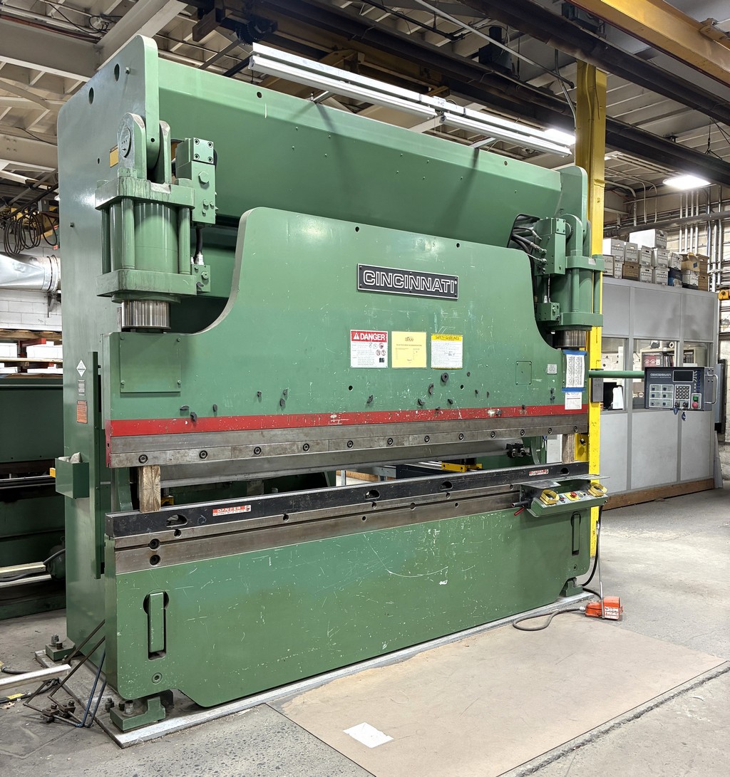 • 230 Ton x 12’ Cincinnati 230 CBII Hydraulic CNC Press Brake, 10’’ Stroke, 126” Between Housings, Cincinnati 3-Axis Control, 2-Axis Heavy Duty Back Gauge, Electric Foot Switch, Dual Palm Controls, Die Rail, S/N 51879 VIEW LOT #0B