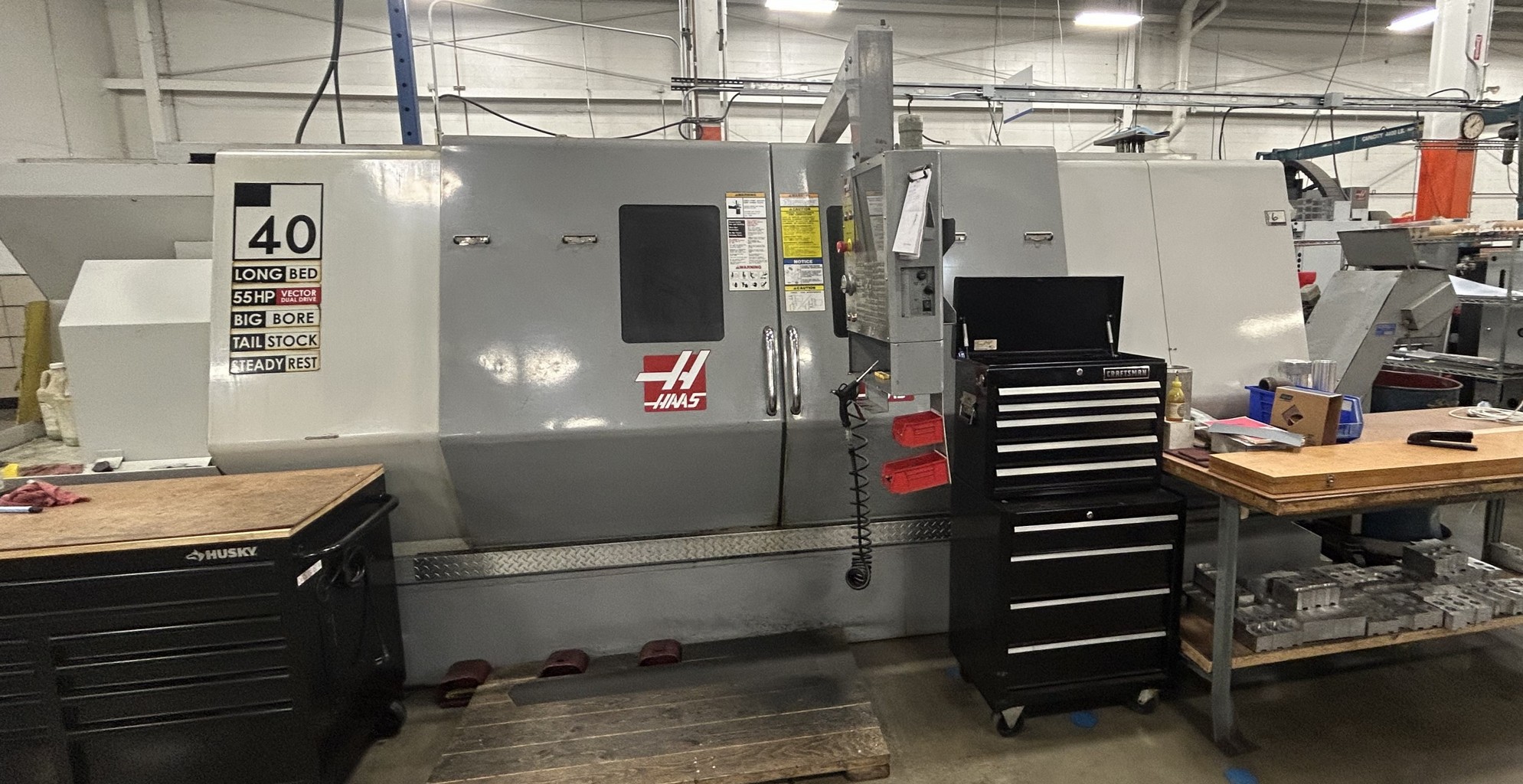 • Haas SL-40LB CNC Lathe, 40” Swing, 80” Centers. 55 HP, Big Bore Tailstock, Steady Rest, Tool Presetter, Chip Conveyor, S/N: 31675037 [2006] VIEW VIDEO / VIEW LOT #47