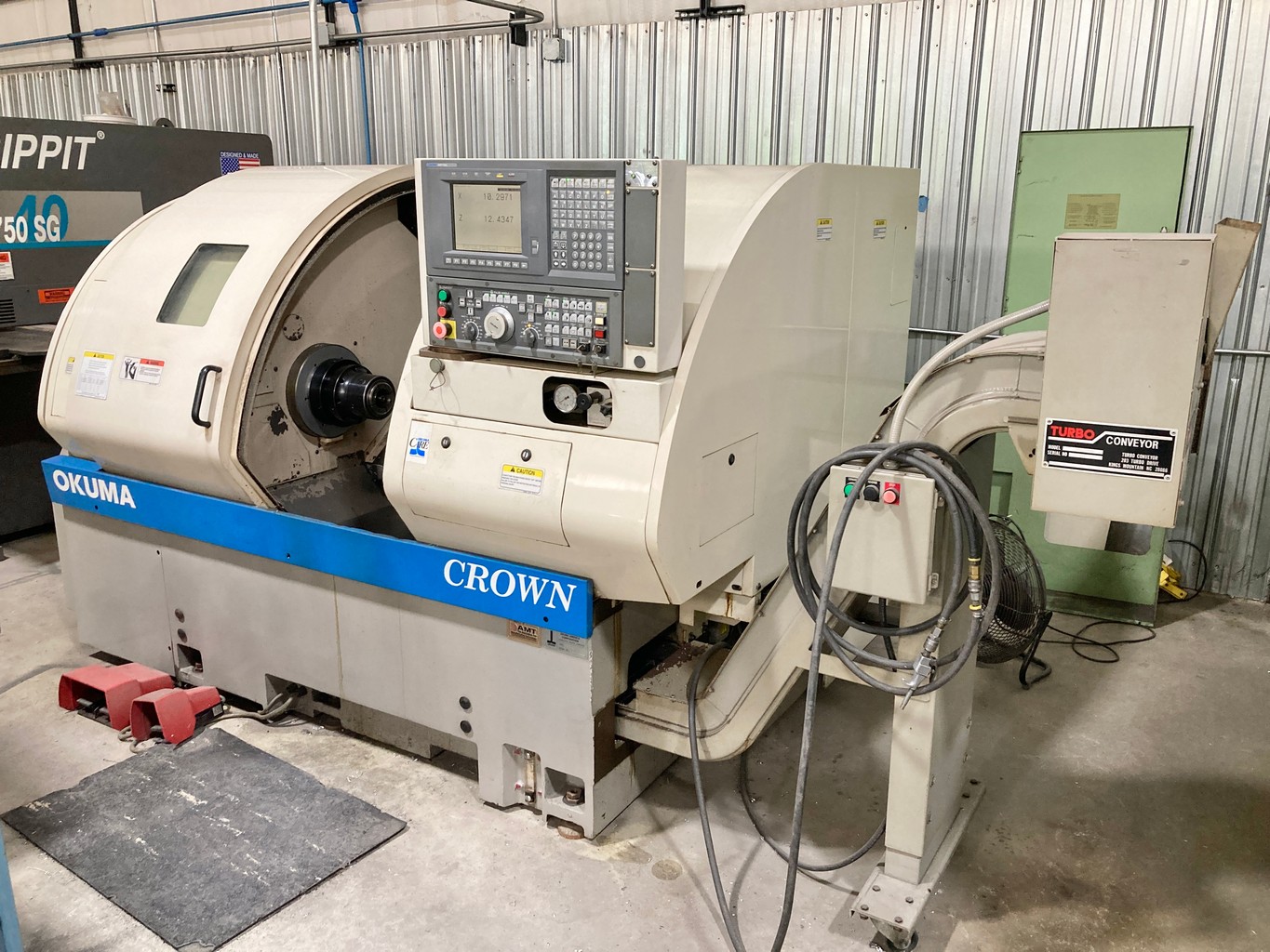 • Okuma 762S-BB Big Bore CNC Lathe, 21.65” Swing Over Bed, 15.75” Swing Over Cross Slide, 10.63” Max. turning Dia., 3.15” Spindle Bore, 65-3500 RPM, J1SA2-8 Spindle, 20.47” Z-Travel, 7.28” Y-Travel, 20HP, OSP700L CNC Control, 10” Chuck, Collet Nose, 12-Position Turret, Tailstock, Chip Conveyor, S/N 09090249 VIEW VIDEO / VIEW LOT #140