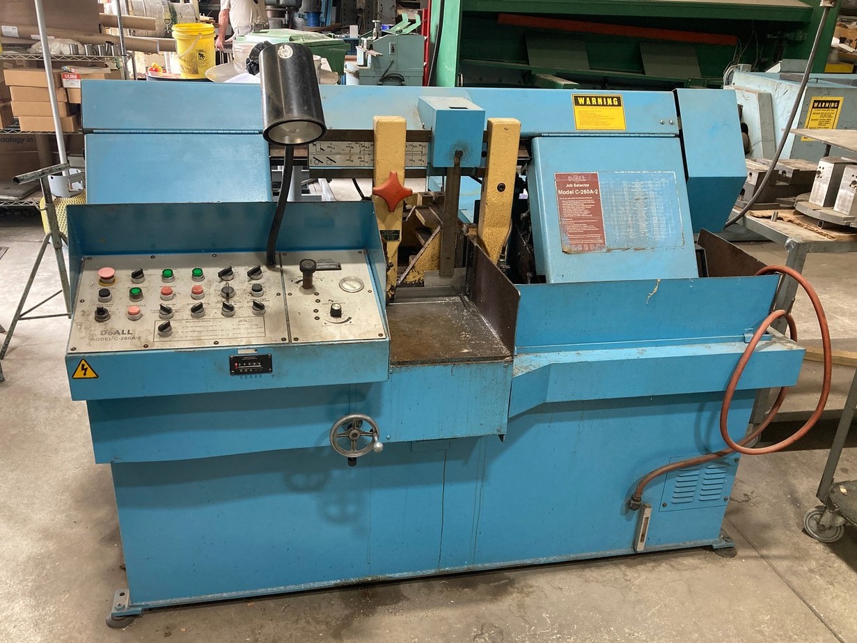 • DoAll C-260A-2 Automatic Horizontal Band Saw, 10-1/4” x 12”, 24” Indexing Bar Feed, Hyd. Vises, 60-350 FPM Blade Speeds, Vari-Speed, 1-1/4″ Blade, Auto Cycle, 10’ Roller Conveyor, Length Indicator, S/N 483-90106 VIEW LOT #130