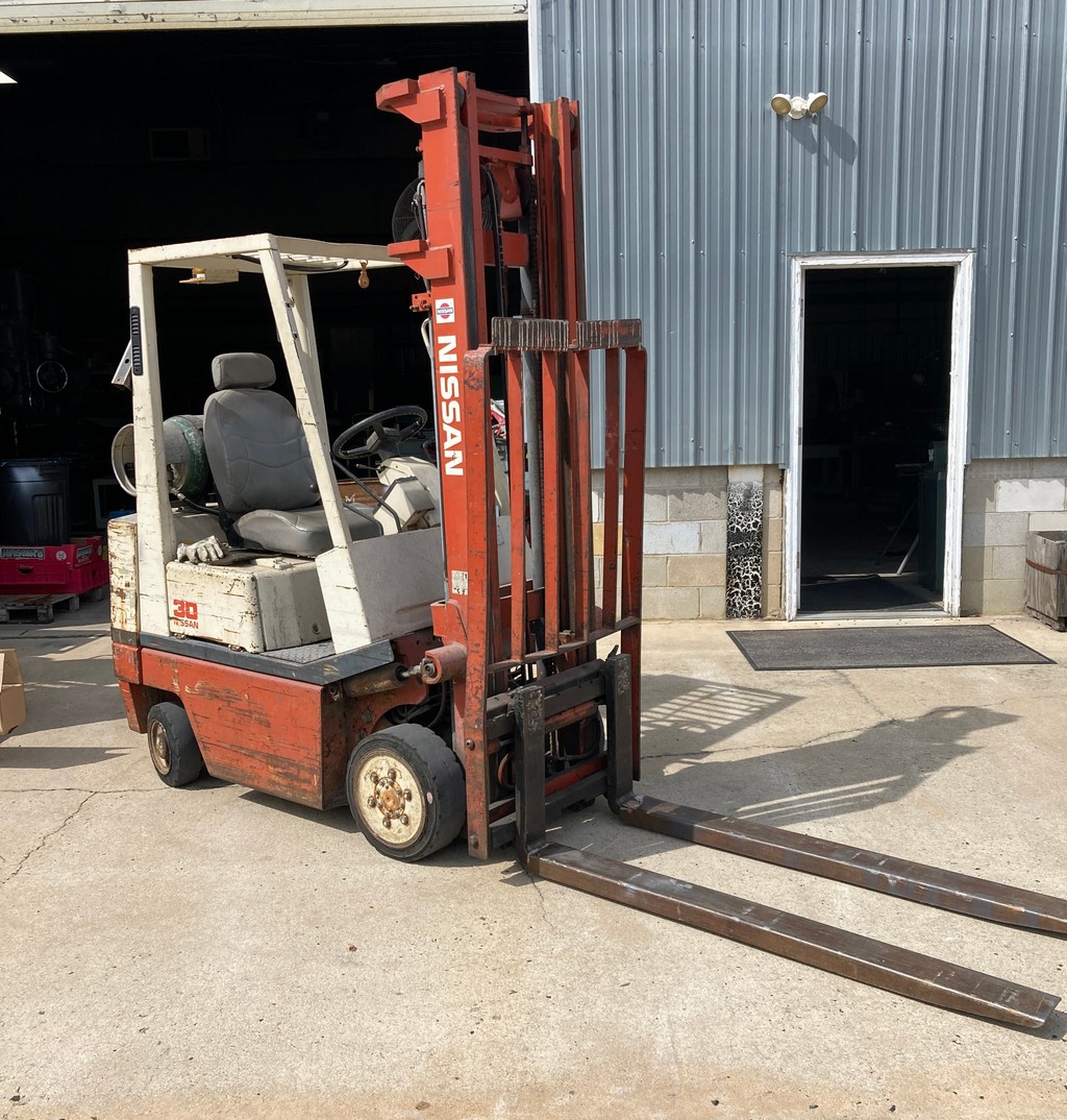 • Nissan 3000LB LPG Forklift, Model CPH01A15PU, Side Shift, Hard Tires, 146” Reach, 42” Forks S/N CPH01P920326 (Fork Extensions Sold Separately) VIEW LOT #350
