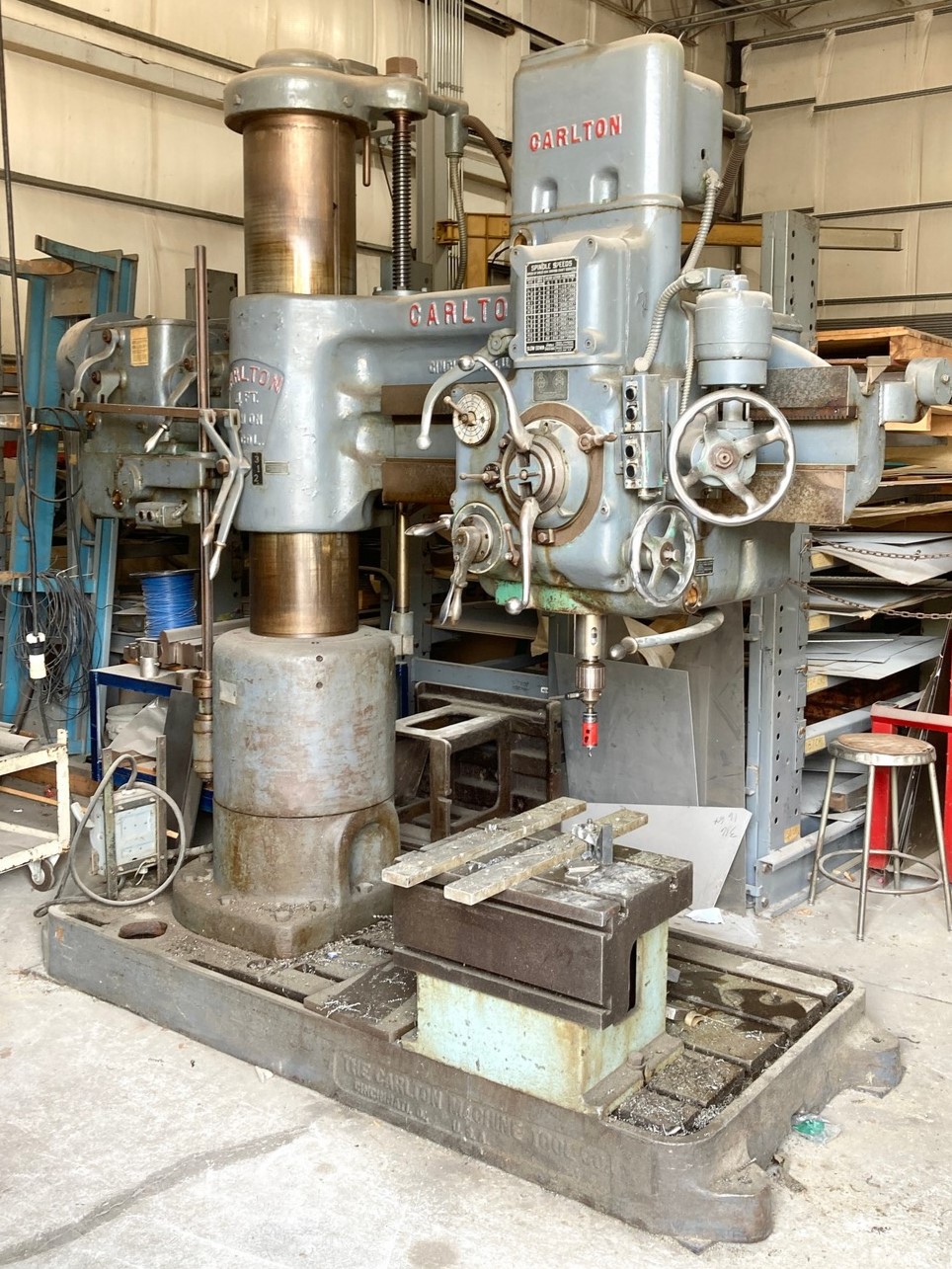 • Carlton 4’ x 13” Radial Arm Drill, Power Elevation, 22-1/2” x 16” x 10” 2-Sided Box Table, Power Clamp, Tee-Slotted L-Base, 48 Spindle Speeds, 15-1500, S/N 3A-2811 VIEW LOT #346