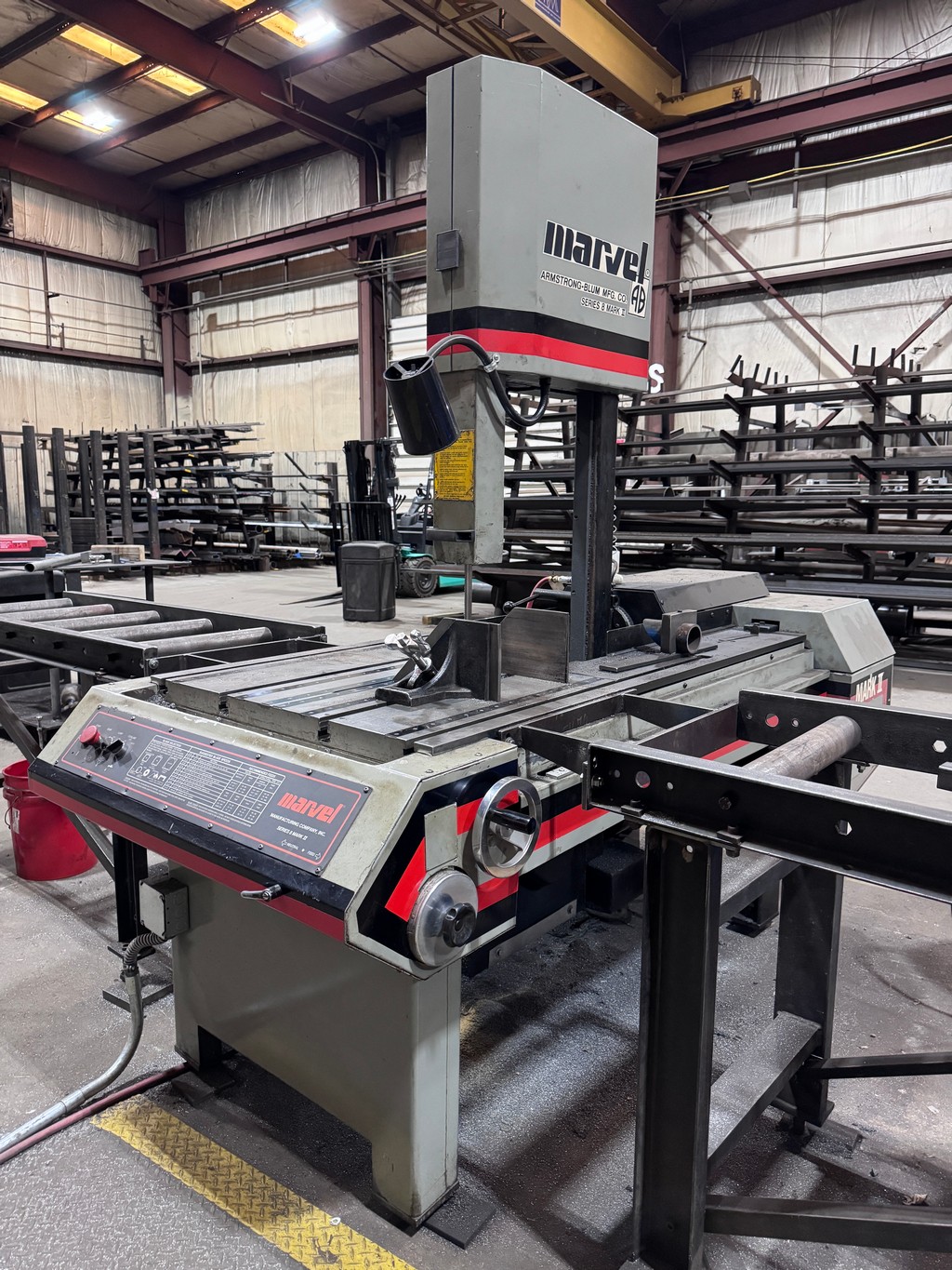 • (2) Marvel Series 8 Mark II Vertical Band Saw, 18” x 22”, 50 – 450 FPM Blade Speeds, 5 HP Blade Drive, Coolant, 1” Blade, Tilt Frame, Roller Conveyor, S/N’s 829717, 830984 VIEW LOT #244 / VIEW LOT #246