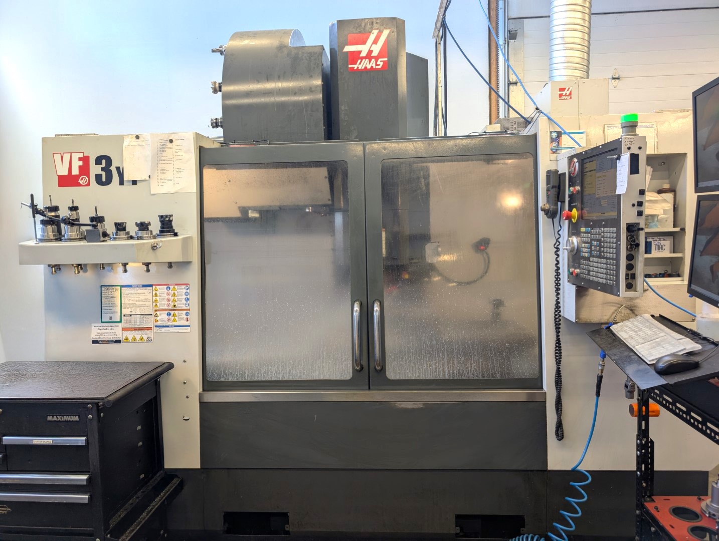 • HAAS VF-3YT/50 4-Axis CNC Vertical Machining Center, X-40″, Y-26″, Z-25″, Haas CNC Ctrl, 10,000 RPM, 30 Station Side Mounted Automatic Tool Changer, Probing System, Pre-Wired 4th Axis, Chip Auger, S/N: 1090240 VIEW VIDEO / VIEW LOT #28