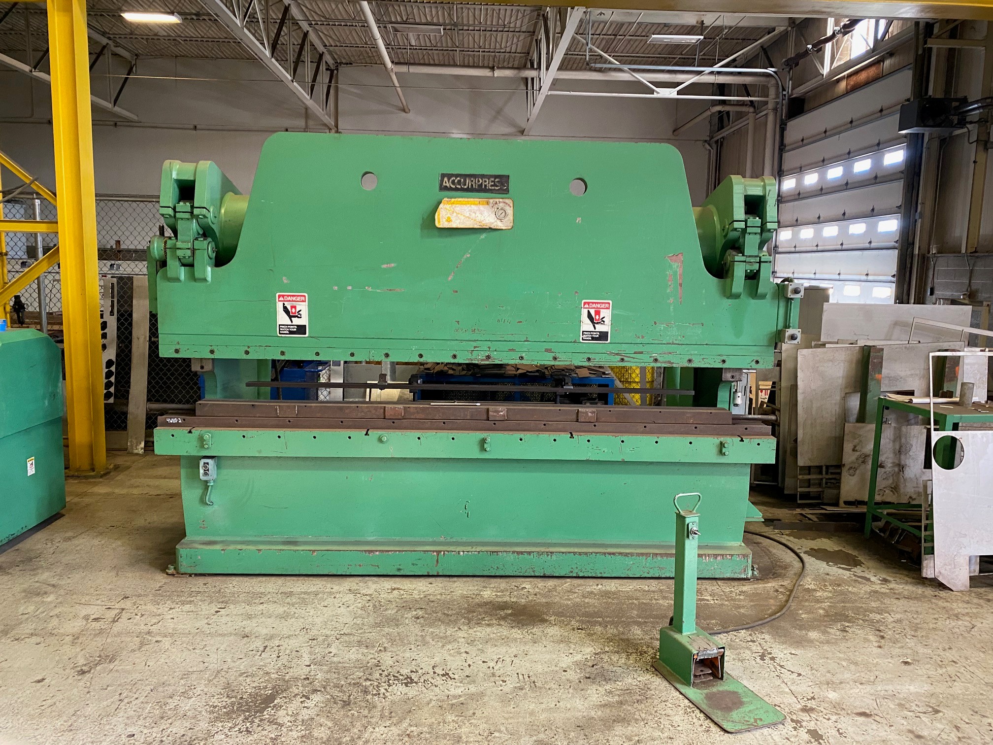 • Accurpress 7250-12 Hydraulic Press Brake, 250 Ton Capaicty, 12′ OA, 10’4″ BH, 8″ Stroke, Pedestal Station, Lower Die Holder, Flush Floor, S/N: 575 VIEW VIDEO / VIEW LOT #24