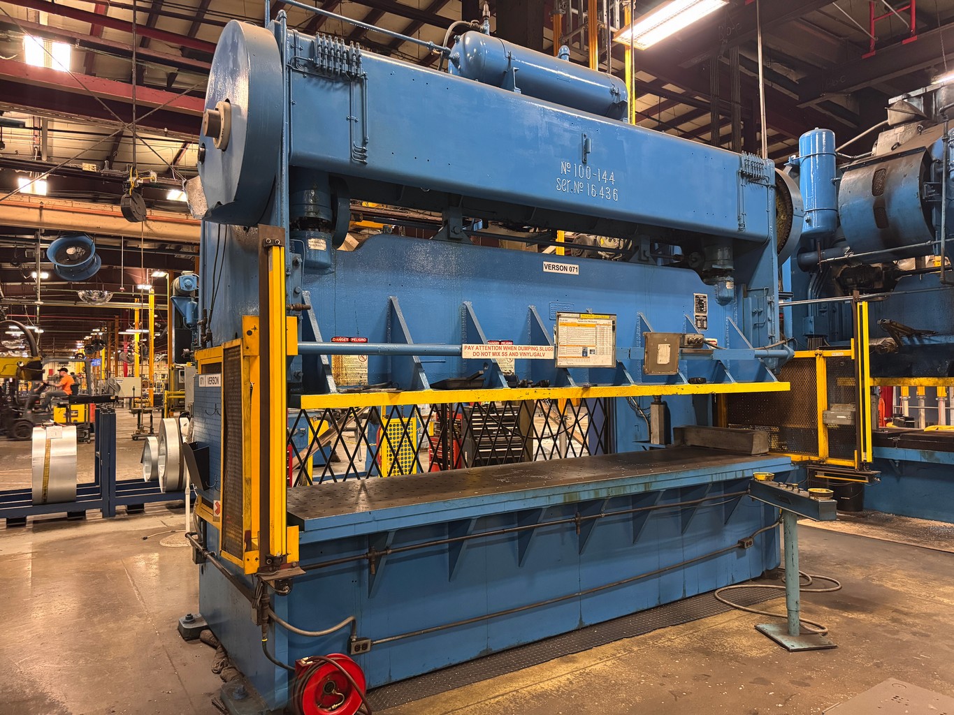 • Verson 100-144 Mechanical Press Brake, 100 Ton, 144” x 36” Flanged Bed, 6” Stroke, 16” Shut Height, 5” Adjustment, 30 SPM, Cieco ISB PCI-100 Press Controls, S/N: 16436